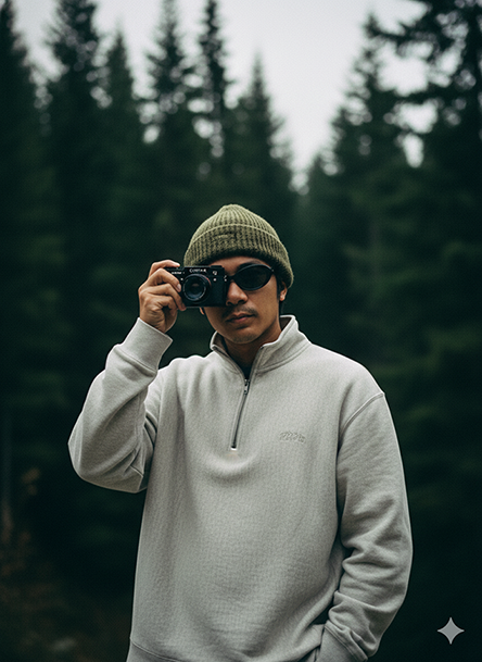 2.5 FlashShort and Punchy (Focus on the look) "Streetwear portrait, cool vibe, vintage film photography, Contax T2, Supreme beanie, muted outdoor lighting." "Hypebeast aesthetic, 35mm film, olive green fuzzy Supreme beanie, black oval sunglasses, neutral sweatshirt, woods background." Detailed (Good for specific gear/mood) A medium close-up shot on 35mm film of a person wearing a fuzzy olive green, holding a black Contax T2 film camera up to their eye. The person is wearing an off-white/grey heathered quarter-zip sweatshirt. Shot outdoors with a soft, cloudy, slightly grainy atmosphere and dark forest in the background, vintage street photography style.