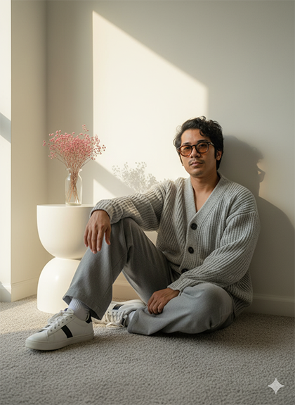 "A cozy indoor portrait of a young man (reference to the man in the