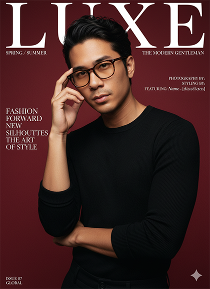 Magazine cover layout: clean minimalist luxury fashion aesthetic,