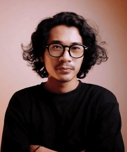 has one hand partly covering his face in a relaxed, dreamy pose,