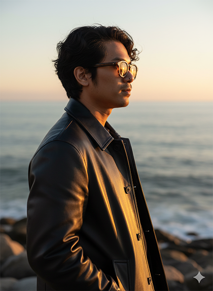 black leather coat with smooth texture, modern and stylish. Lighting: