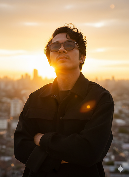 blurred cityscape with warm glowing sunlight. Lighting: strong
