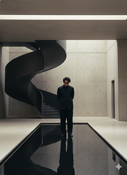 sculptural staircase and a long, shallow reflecting pool that mirrors the