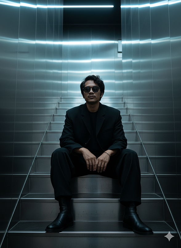 dinding logam reflektif. ia mengenakan outfit