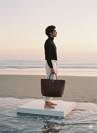 rigid leather tote. He stands in profile, hands in his pockets, chin slightly