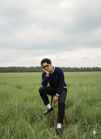 Full-body editorial photo of a young male (reference to the man in