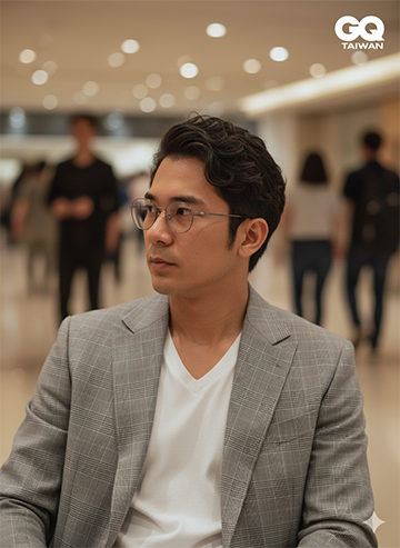 Pose: model sitting upright, turning his head gently to the left, gaze