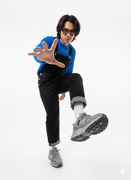 “Dynamic fashion photoshoot of a young man (reference to the man