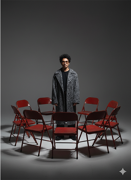 chairs. Camera angle: straight-on, full-body shot. Pose: standing