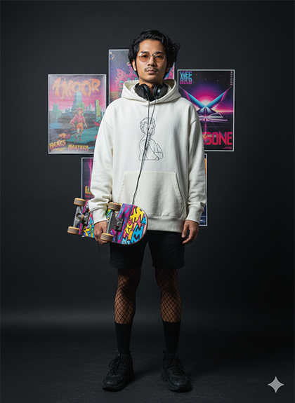 skateboard in one hand, wearing an oversized off-white hoodie with