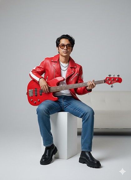 while holding a red electric bass guitar.