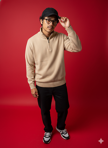 half-zip sweater, loose black pants, and stylish black-white