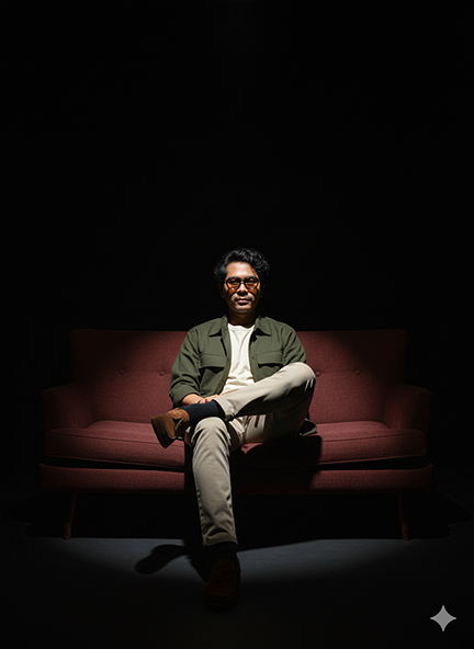 Subject: A handsome South Asian man in his late 20s to early 30s, with dark hair and a confident, relaxed demeanor. He is seated centrally on a vintage, low-slung dark red or maroon sofa. He is dressed in smart casual