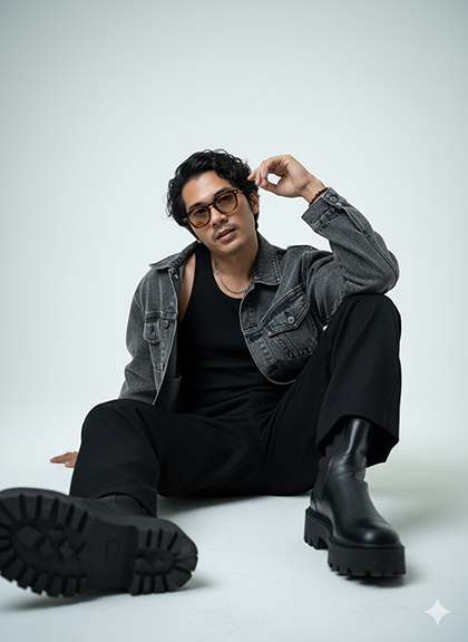2.5 FlashUltra-realistic modern street-fashion editorial portrait of a stylish man sitting casually on a clean studio floor, captured with a low-angle wide shot using an 85mm lens at f/2.8 aperture. The camera is positioned slightly below knee level and tilted upward about 25 degrees, emphasizing depth and perspective. His legs dominate the foreground while his torso and face stay in sharp focus, creating a cinematic sense of distance and attitude.