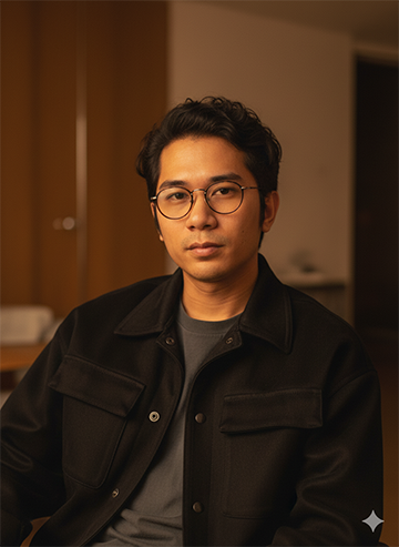 a muted dark t-shirt, warm indoor lighting with golden highlights